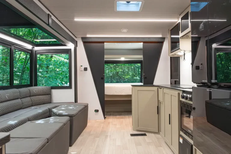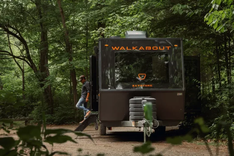 The Keystone Walkabout is a rugged, off-grid travel trailer built for serious adventure. Designed with outdoorsman Steven Rinella, it features wood-free HyperCore construction, 15-inch all-terrain tires, CURT touring suspension, and a one-touch auto-leveling system for confident towing. Inside, you’ll find an atrium-style slide, oversized gear storage, integrated fishing rod hooks, and a rear gear door for bikes or hunting equipment. With an available 440-watt solar package and Victron control system, the Walkabout is a fully capable mobile basecamp, ready for your next journey.